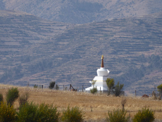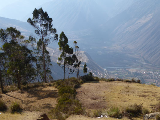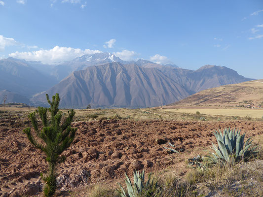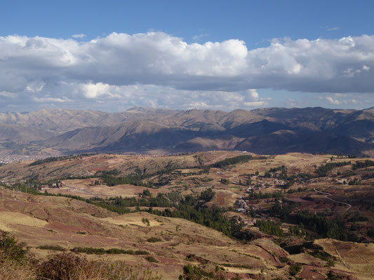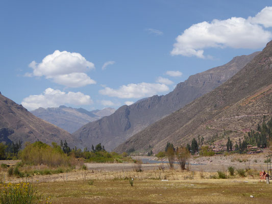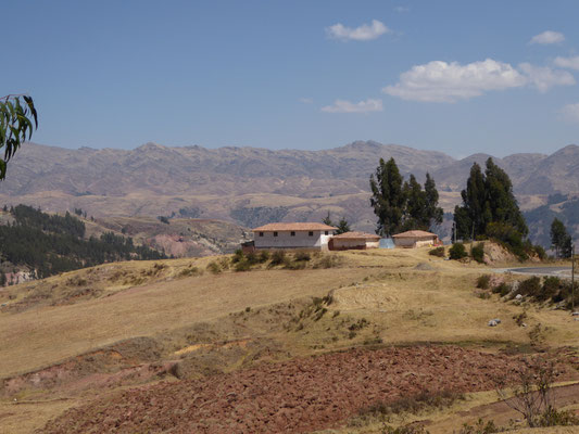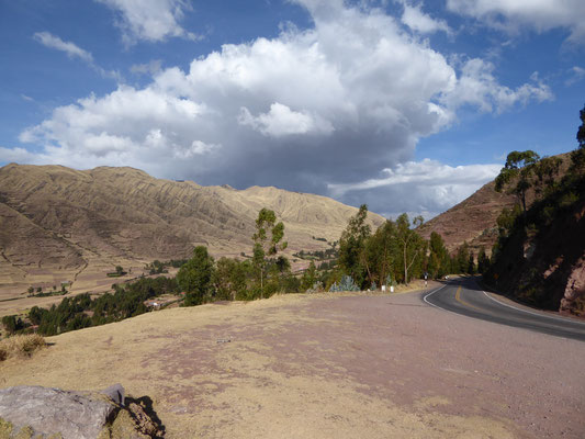 Von Cusco nach Chinchero führte die Straße durch vertrocknete Landschaften, mit mehreren längeren An- und Abfahrten. Vor Chinchero war etwas abseits der Straße ein kleines Bauwerk, das aussah wie eine buddhistische Stupa (?). Nach dem Ort fuhren wir noch etwas auf und ab, bis eine etwas 12km lange Abfahrt uns ins Heilige Tal der Inka brachte.