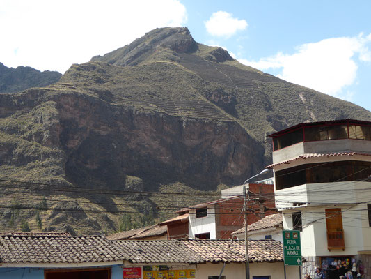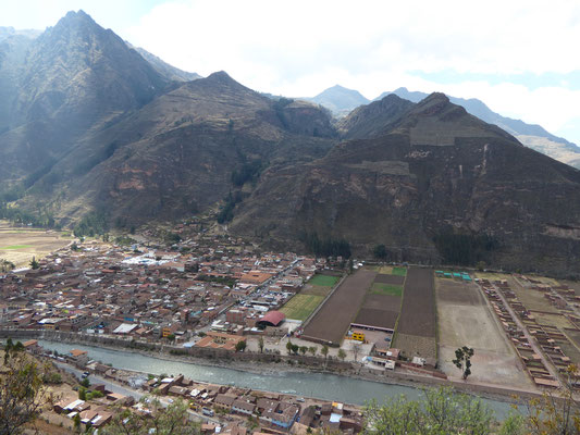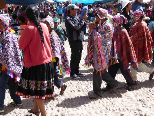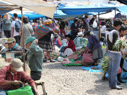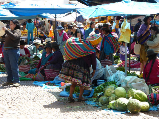 Pisaq liegt knapp 3000m hoch und der Sonntag ist der traditionelle Markttag. Es gibt alles zu kaufen was im fruchtbaren Tal und an den Hängen angebaut wird: Zwiebeln, Bananen, Mangos, Mais in allen Farben, Cocablätter, Avocados, Papaya, ... . Auch an den Bergflanken oberhalb Pisaqs reihen sich wieder an- und übereinander Terrassen. Die Terrassen reichen bis auf 4500m. Sie steuern den Regenwasserabfluss von den Hängen, schützen so vor Erosion und bieten ausreichend Ackerfläche.