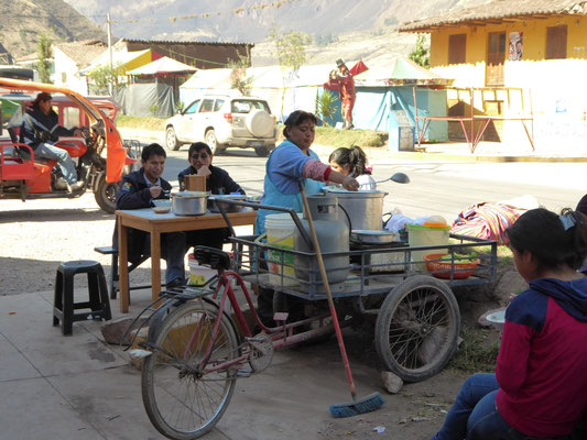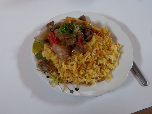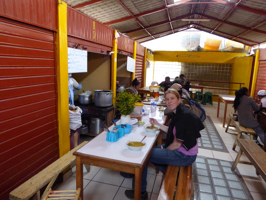 Trotz des ganzen Touristenrummels gibt es abseits einen traditionellen Markt mit den üblichen Garküchen. Zu jedem Essen gehört immer eine ordentliche Suppe vorweg. Das Hauptgericht ist lomo saltado, gebratenes Rindfleisch mit Tomaten und Zwiebeln, hier serviert mit Reis, Nudeln und Kartoffeln.