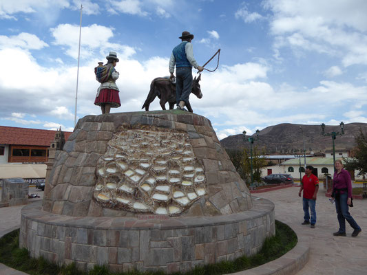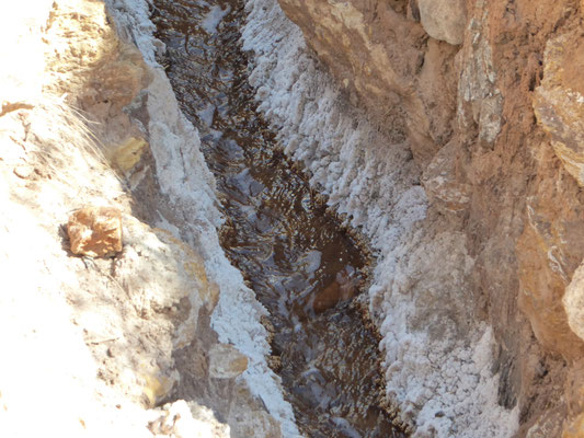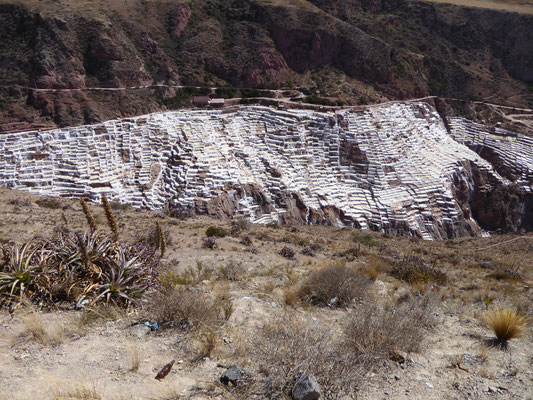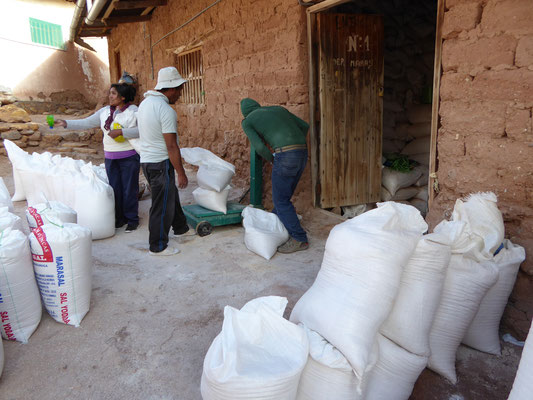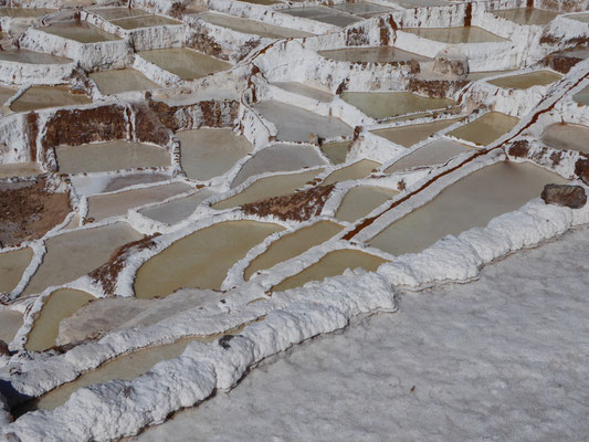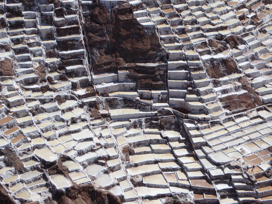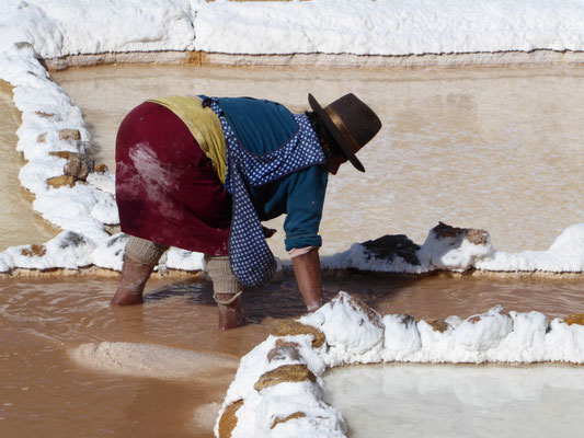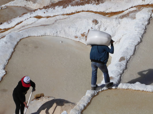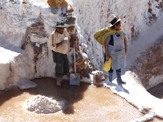 Bei Maras kommt extrem salzhaltiges Wasser aus dem Berg, das in weit über tausend Becken aufgefangen wird. Dort verdunstet das Wasser, übrig bleibt eine harte Salzschicht. Die Salzschicht wird in Handarbeit abgeschabt und das Salz dann in Säcken abtransportiert.