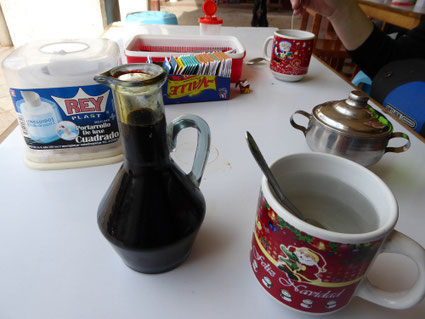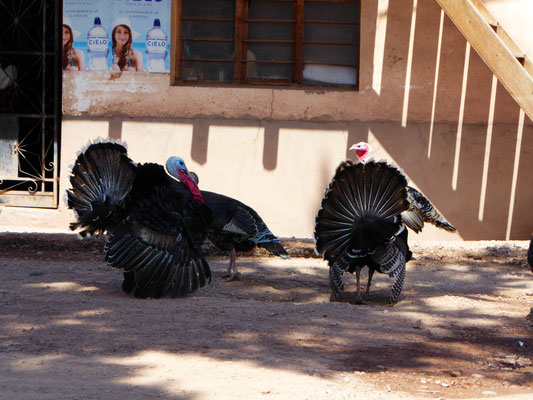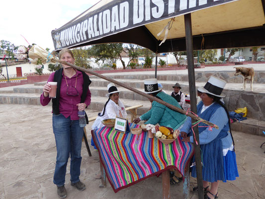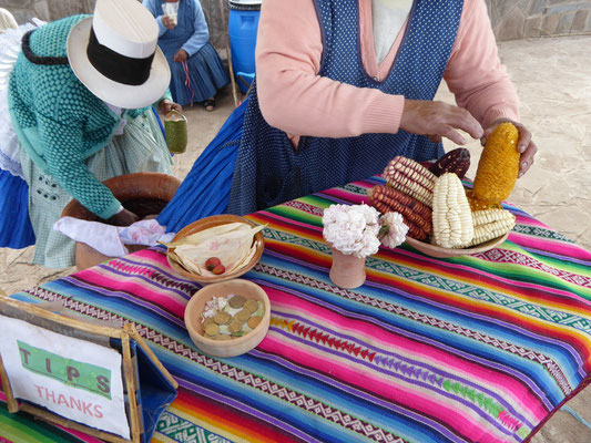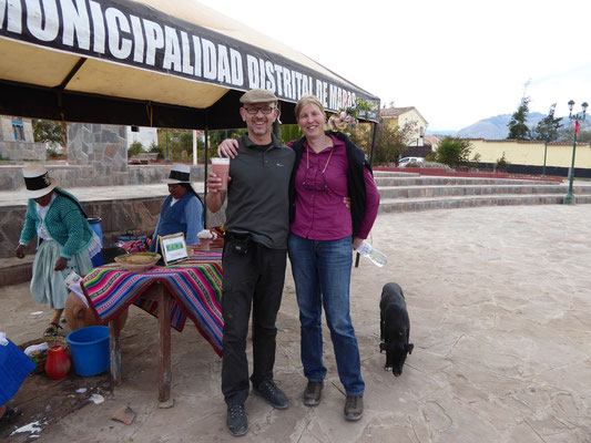 In Maras, einem kleinen verschlafenen Ort, haben wir unser erstes Chicha getrunken. Es ist ein leicht säuerliches, sehr erfrischendes, hausgemachtes Maisbier. Um den Gärprozess in Gang zu bringen benutzen die Frauen Speichel. Unserem Chicha sind Erdbeeren hinzugesetzt, aus dem Grund ist es leicht rötlich. Mais gibt es hier in allen möglichen Farbtönen von hellbeige bis dunkelviolett.