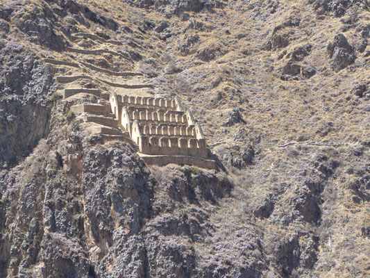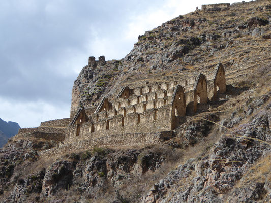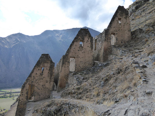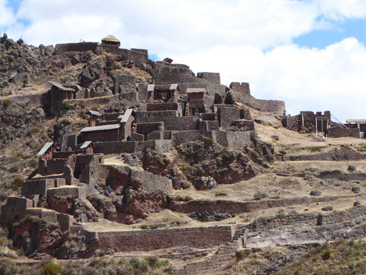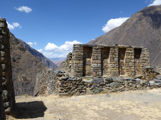 Gegenüber der Tempelburg sind noch Reste weiterer Befestigungsanlagen zu erkennen und die noch gut erhaltenen, hausähnlichen Vorratsspeicher von Pinkuylluna. Diese sind so konstruiert, dass der Wind zwischen den Gebäuden hindurchblasen konnte und so für Kühlung sorgte.