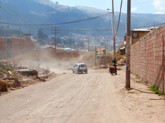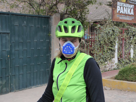 Von Urubamba geht es weiter nach Pisaq. Brittas kontinuierlicher Husten lässt sich durch eine Staubmaske arg verringern.